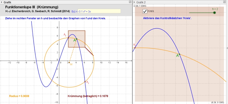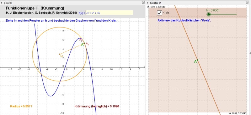 Analytisch ist die Krümmung eines Graphen ein anspruchsvolles Konzept. Geometrisch ist es einfach: Wir können jetzt den Graphen lokal gekrümmt dadurch approximieren, dass wir (anstelle der beiden Sekanten) durch die drei Punkte Al, A und Ar einen Kreis konstruieren. Wird h wieder immer kleiner, so stabilisiert sich bei gutartigen Funktionen dieser Kreis und wird anschaulich zum Schmiegekreis (Elschenbroich 2014). Der Kehrwert dieses Kreisradius ist betraglich die Krümmung an dieser Stelle.Dies sieht man vor allem im linken Fenster. Im rechten Fenster sieht man zunächst die lokale Annäherung des Kreises an den Funktionsgraphen bei immer kleinerem h. Schlussendlich sieht man aber nur noch eine gemeinsame gerade Linie.